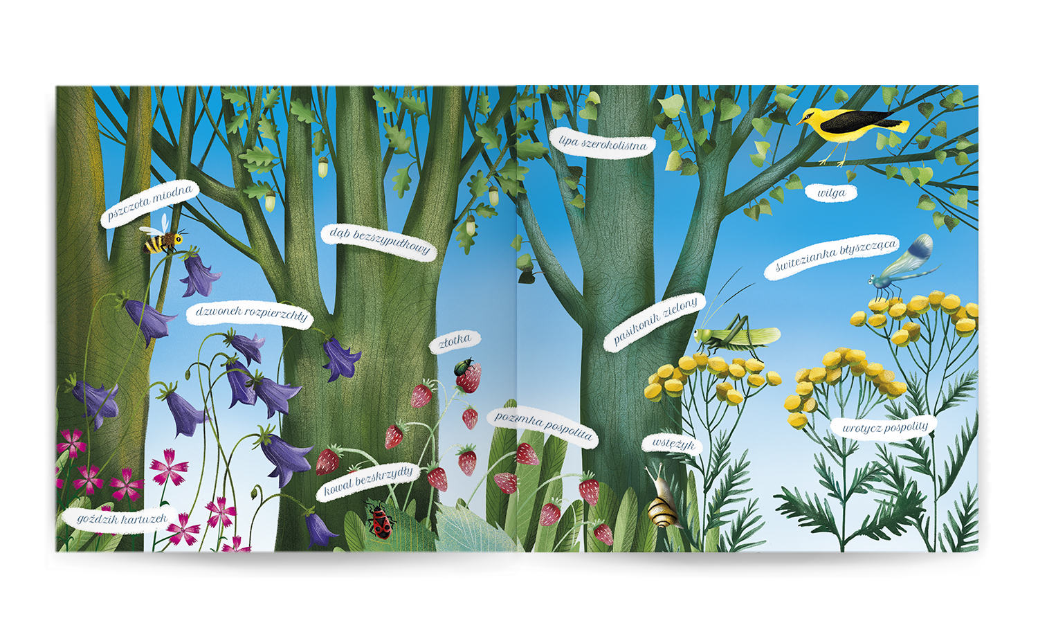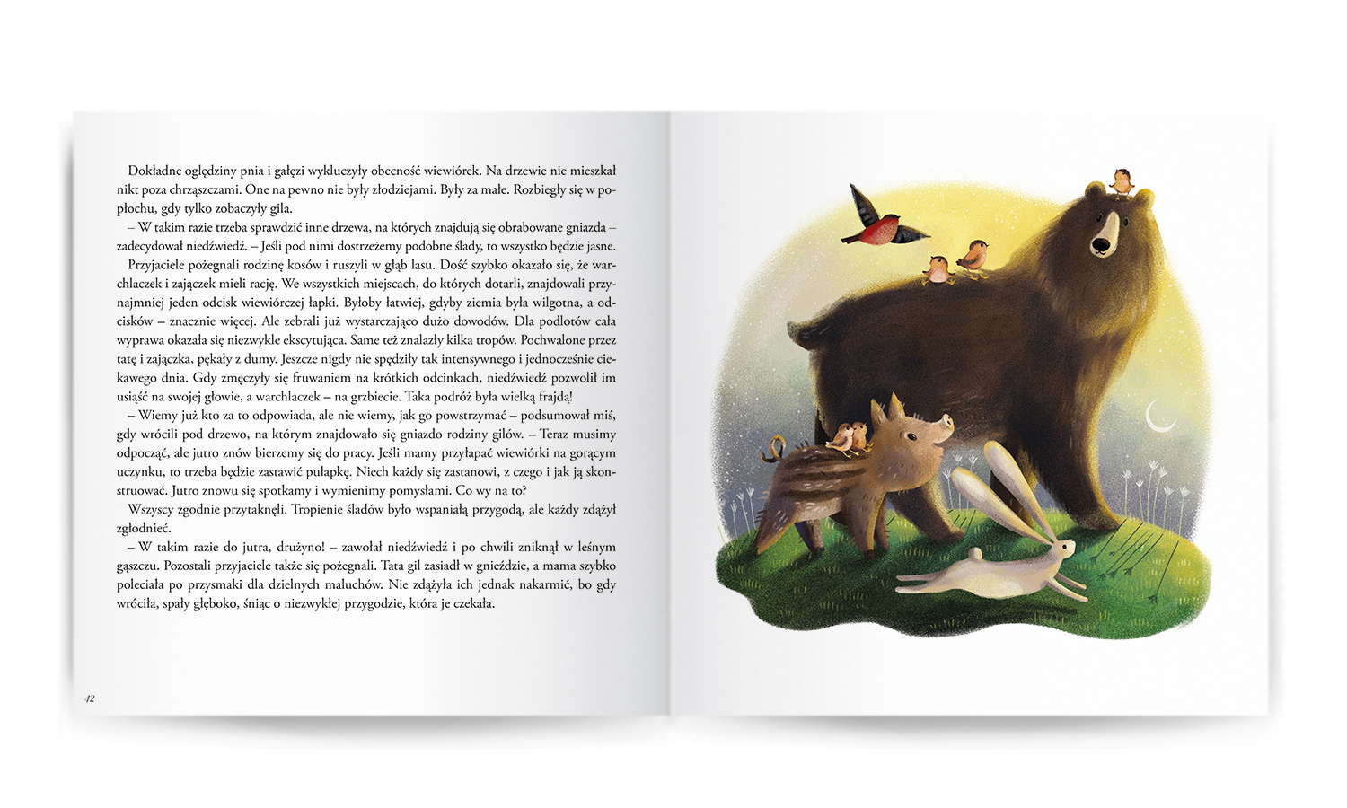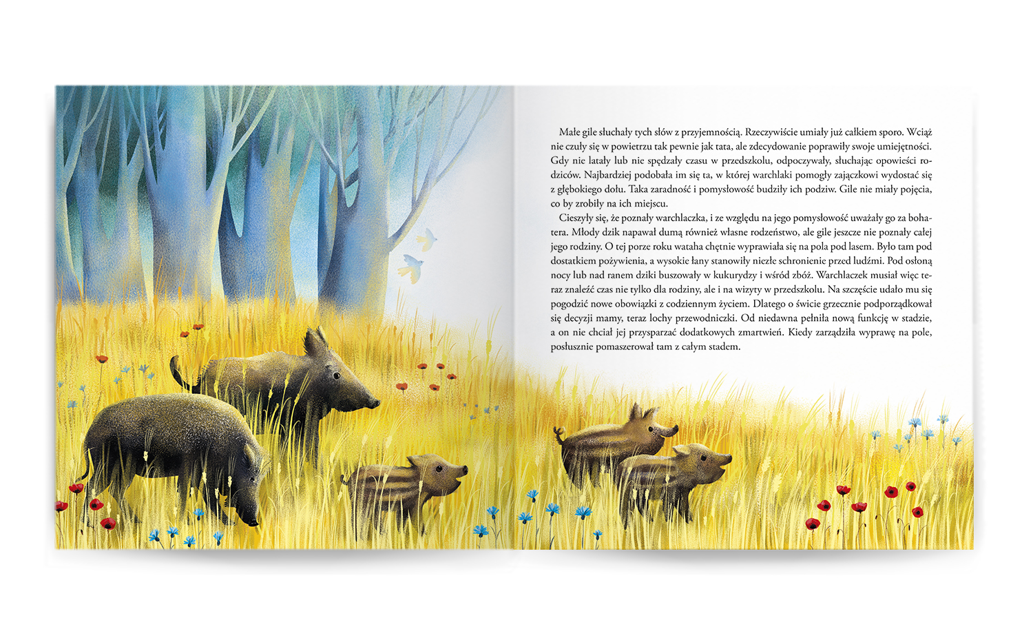 Trzecia z serii czterech książek o przygodach leśnych mieszkańców. Przedstawia przygody stadka pięciu młodych gili, które zaprzyjaźniają się z bohaterami innych części cyklu: zajączkiem, misiem i warchlakiem. Lato w lesie to przede wszystkim nasycona zieleń liści i mnóstwo kolorowych kwiatów i owoców, ale też spokojne, ciepłe poranki nad rzeką i długie wieczory z powoli ciemniejącym niebem. Trudno było też oprzeć się pokusie narysowania łanów dojrzałych zbóż przetykanych chabrami i makami.