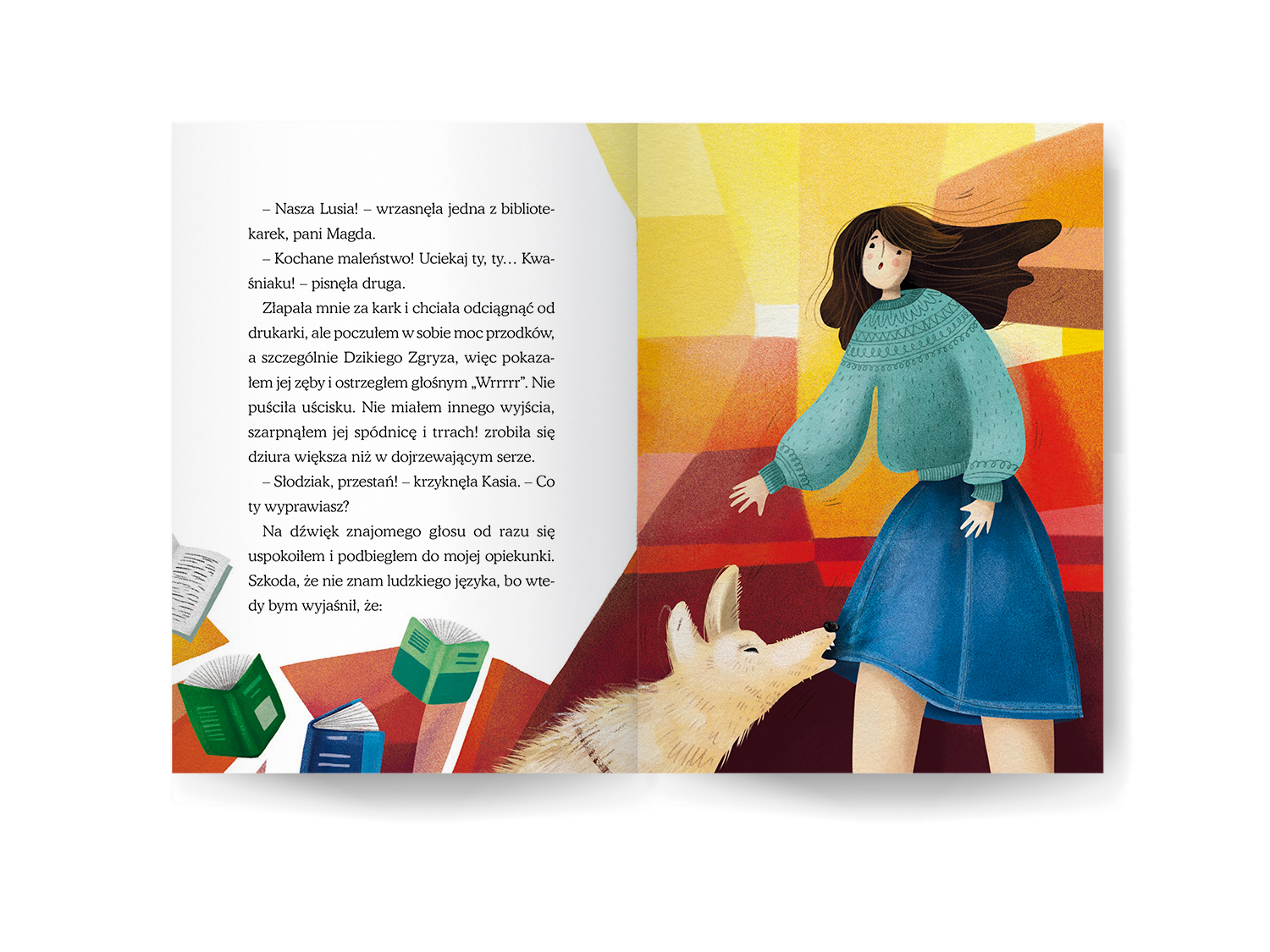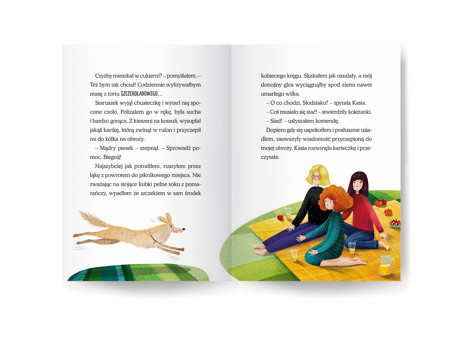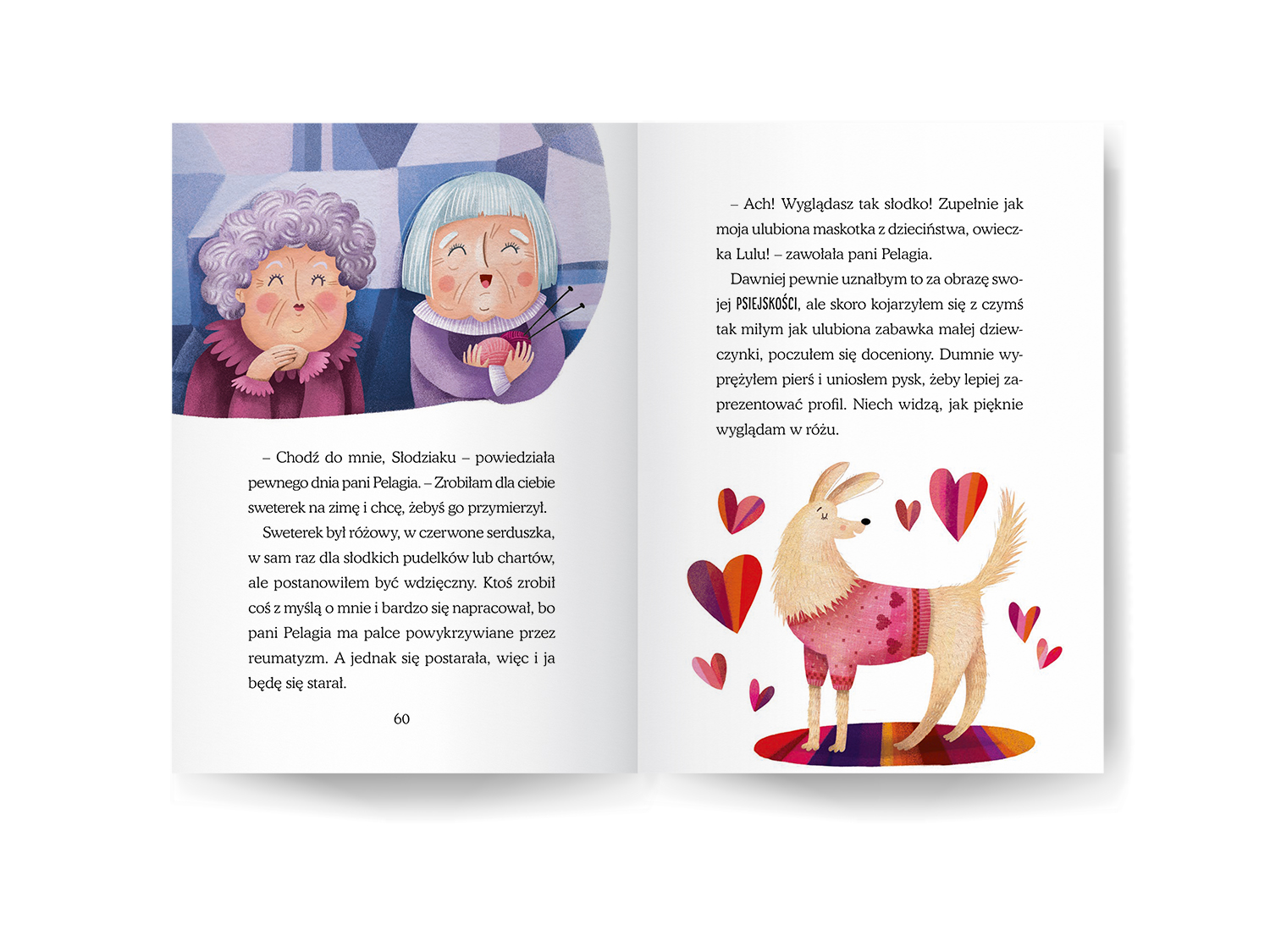 Podczas ilustrowania „Słodziaka” - uroczej opowieści o piesku, który wcale nie jest taki słodki, jak wskazuje na to jego imię - postanowiłam wrócić do przeszłości. Użyłam specyficznej stylistyki walorowej, którą posługiwałam się dawno temu, przed kilkunastoma laty - jeszcze zanim odważyłam się zacząć studia na ASP i zająć zawodowo ilustracją. Marzyłam wtedy o projektowaniu witraży i tak właśnie witrażowo malowałam, komponując pociachane płaszczyzny mocnych kolorów, niekiedy udekorowane deseniem. Okazało się to użyteczne zwłaszcza w ilustrowaniu ekspresyjnych scen.