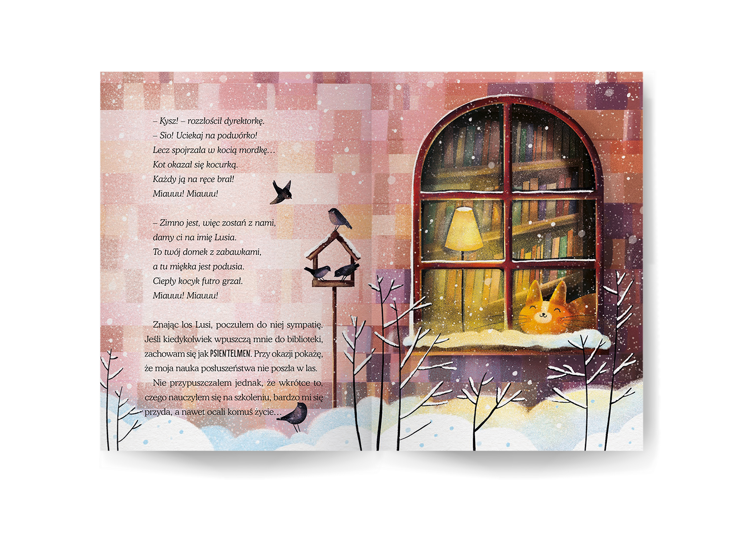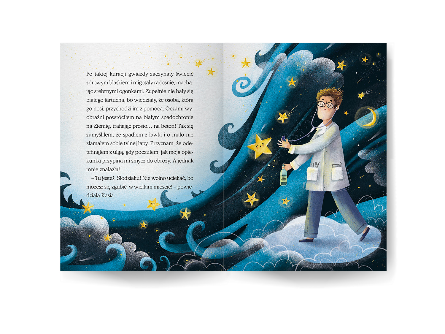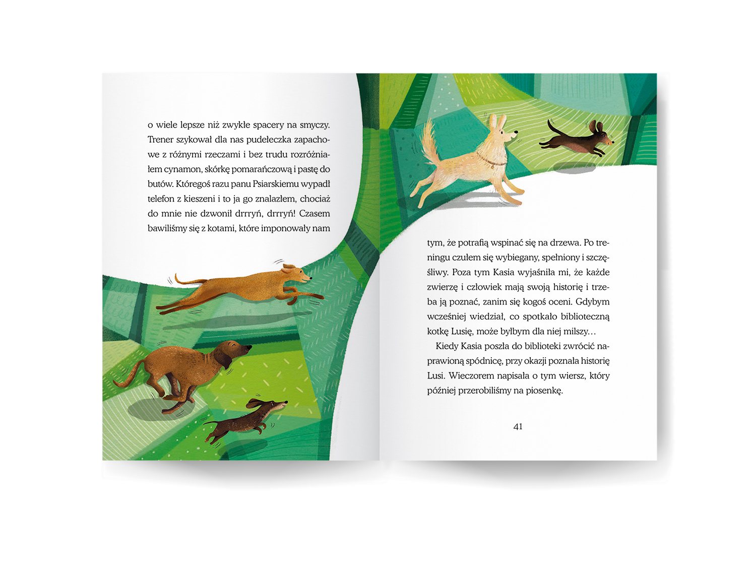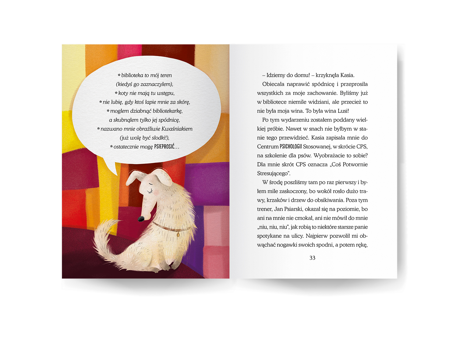 Podczas ilustrowania „Słodziaka” - uroczej opowieści o piesku, który wcale nie jest taki słodki, jak wskazuje na to jego imię - postanowiłam wrócić do przeszłości. Użyłam specyficznej stylistyki walorowej, którą posługiwałam się dawno temu, przed kilkunastoma laty - jeszcze zanim odważyłam się zacząć studia na ASP i zająć zawodowo ilustracją. Marzyłam wtedy o projektowaniu witraży i tak właśnie witrażowo malowałam, komponując pociachane płaszczyzny mocnych kolorów, niekiedy udekorowane deseniem. Okazało się to użyteczne zwłaszcza w ilustrowaniu ekspresyjnych scen.